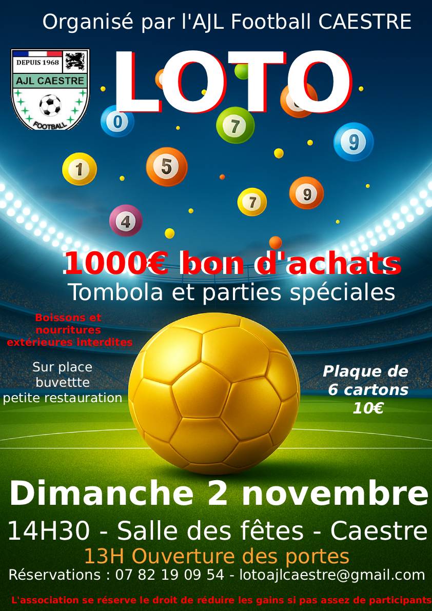 L'AJL Football de Caestre organise son loto le dimanche 2 novembre à 14h30 à la salle des fêtes.