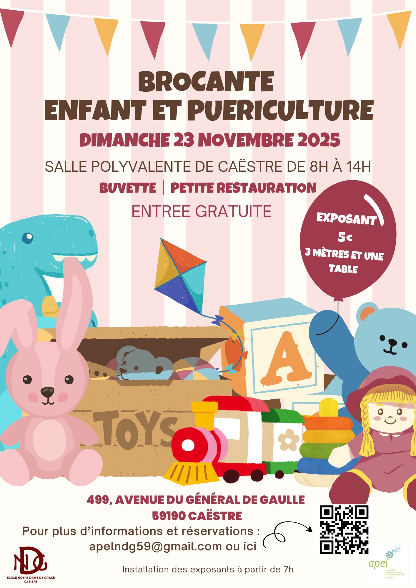 L'APEL de l'école Notre Dame de Grâce organise sa bracante enfant et puériculture le dimanche 23 novembre à la salle polyvalente.